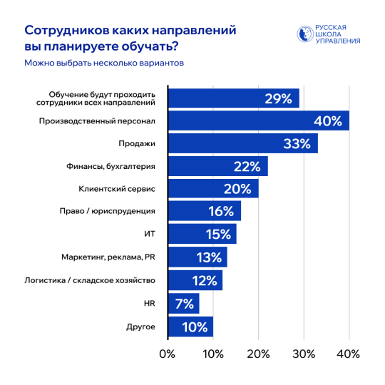 Данные опроса показывают, что большинство компаний системно подходят к развитию персонала: 53% планируют обучать сотрудников всех уровней. Остальные выбирают более точечный подход: 45% будут развивать линейных специалистов, 38% — руководителей подразделений, 11% — топ-менеджеров.